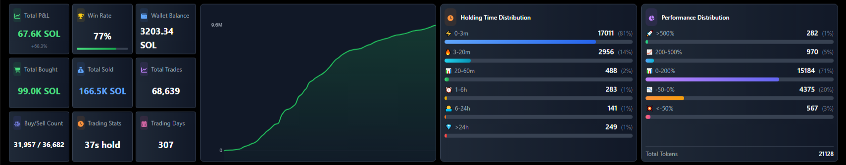 The **Analytics & Distribution** section transforms your raw trading data into actionable insights. By combining high-level metrics, a dynamic P\&L chart, and detailed distribution breakdowns, you gain a clear understanding of both your results and your trading style. This empowers you to refine your strategies, manage risk, and build on your strengths as a Solana trader.